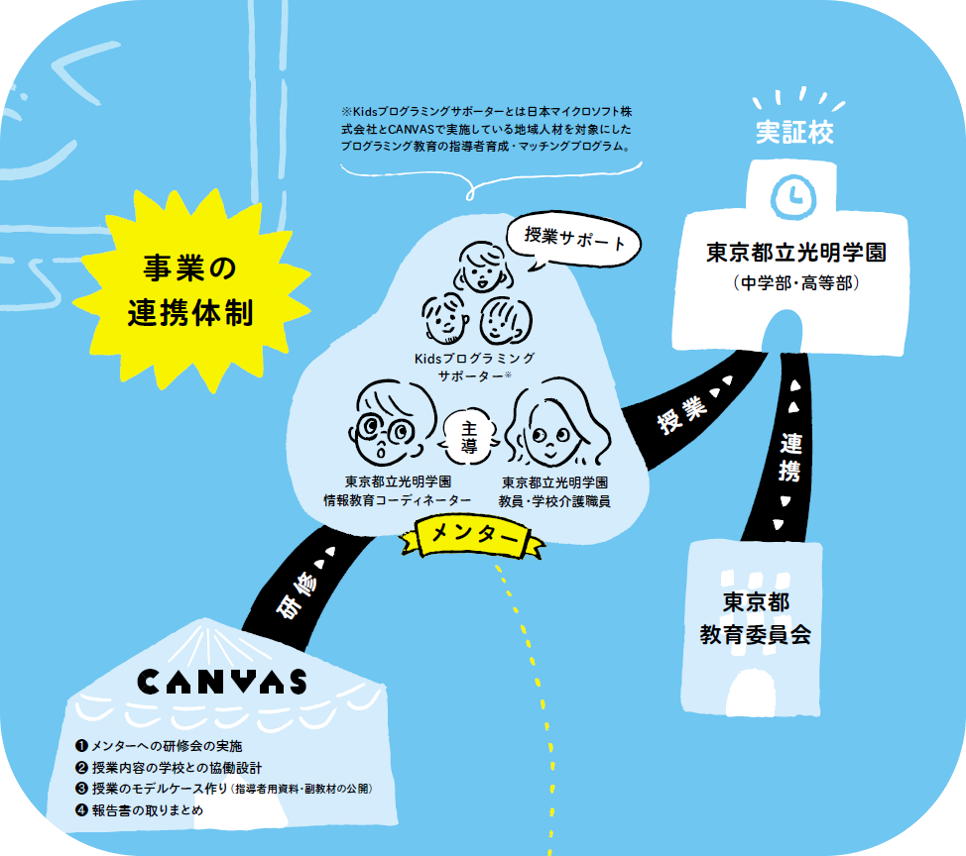 メンター(授業サポート人材)は、プロジェクトの取り組みの1つで地域人材を対象にしたプログラミング教育の指導者育成マッチングプログラム・Kidsプログラミングサポーターのコミュニティから募集し、CANVAS・東京都立光明学園・Kidsプログラミングサポーター三者が連携して実証を行いました。