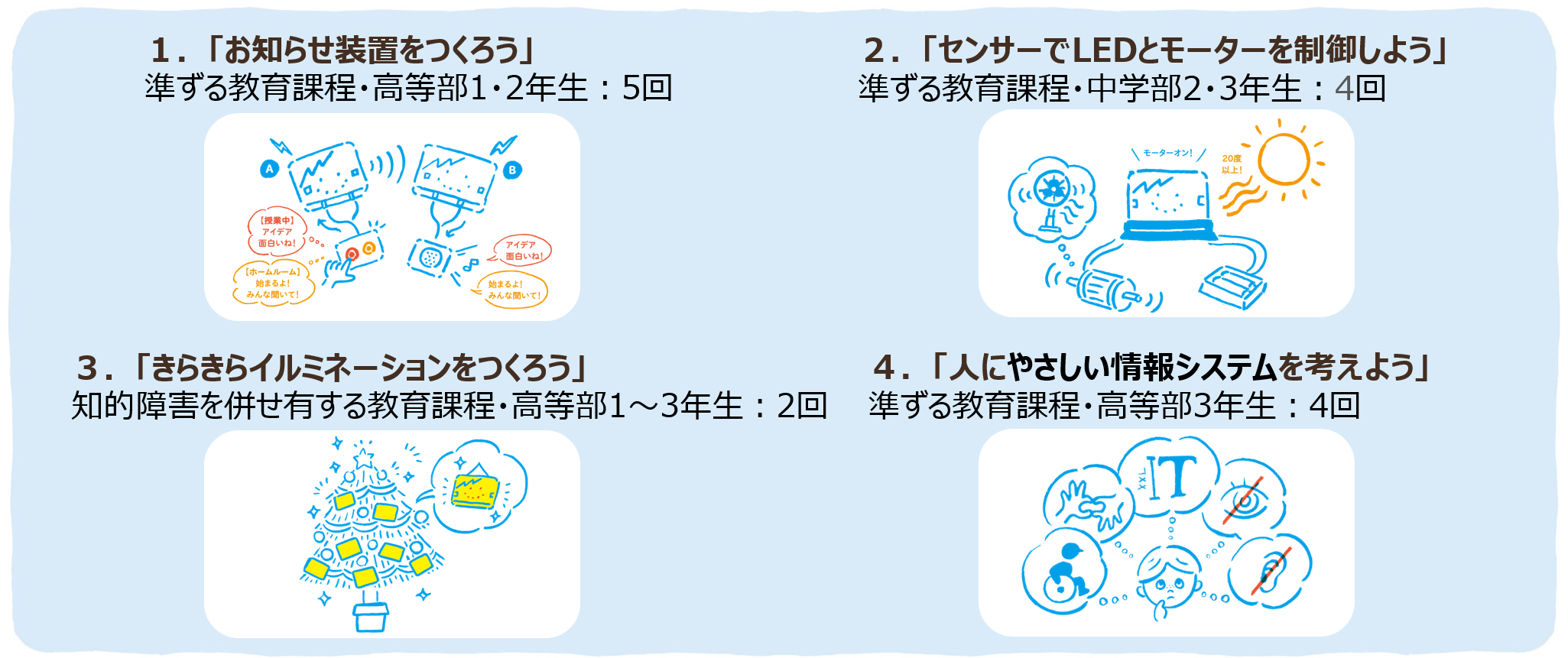 3つの視点や生徒の特性を踏まえ、自分や他者へのサービスを考える事や、世の中の技術や製品の仕組みを知ってもらうために、自分以外の生徒が使う事を想定して作品をつくる事や、IT企業社員の方からの仕事紹介を聞く体験などの内容を4つのプログラミングの授業に取りいれました。