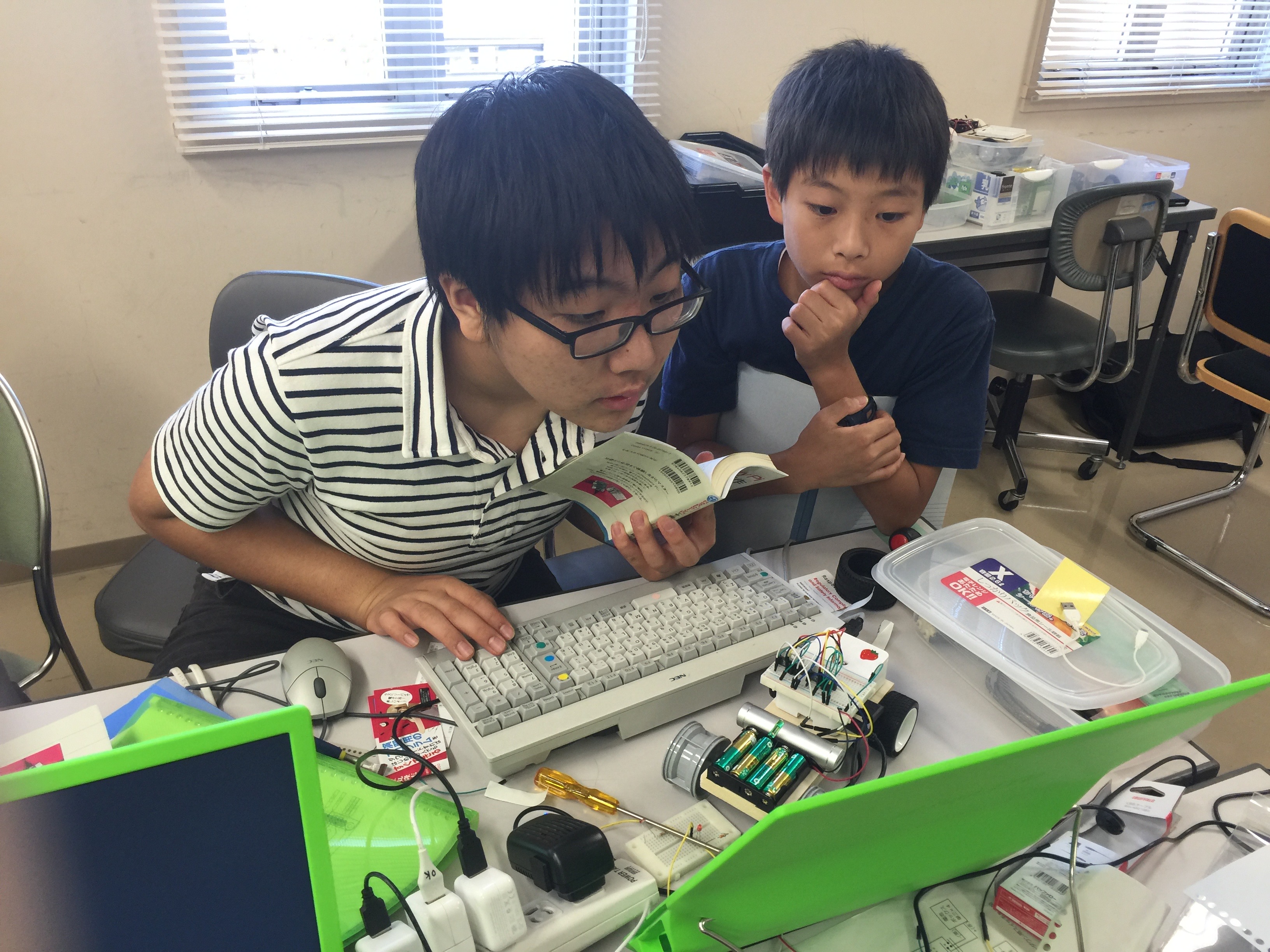 また、「科学の学校」では、年間5回ほど、2-3日間の短期講座を実施しています。2016年の夏休みには、「RasPi講座」を3日間、「RasPi Carを走らせる」を2日間、「ロボコンパワーアップ講座」を2日間×2回、「iOS App作成講座」を1日間実施いたしました。