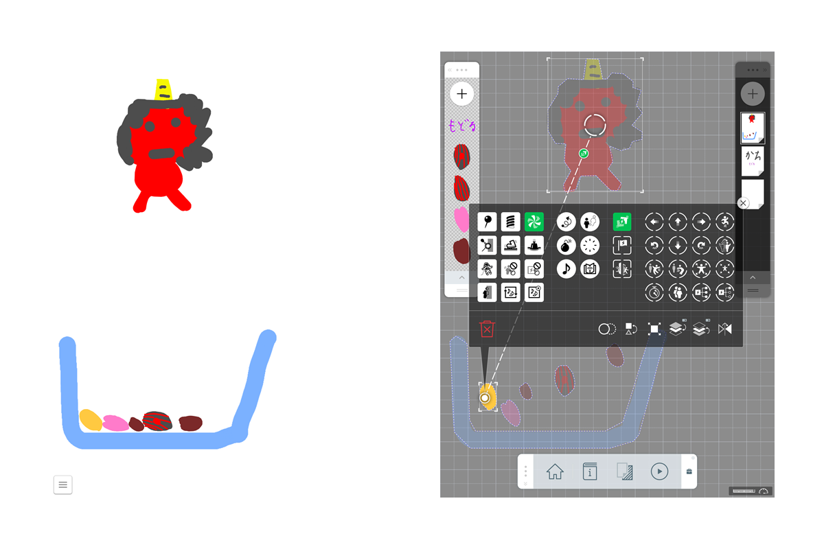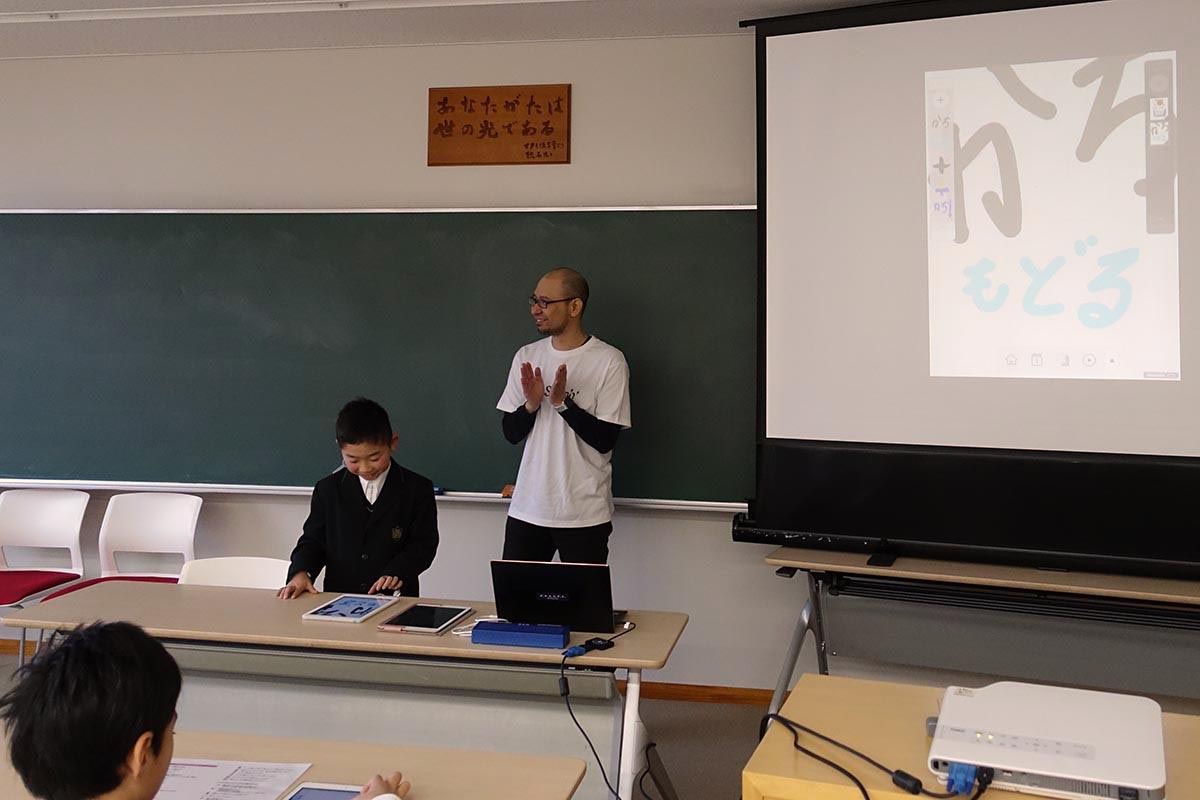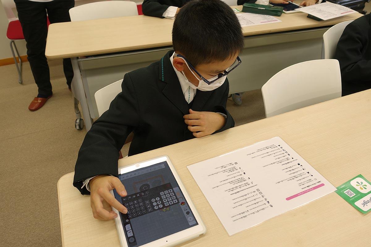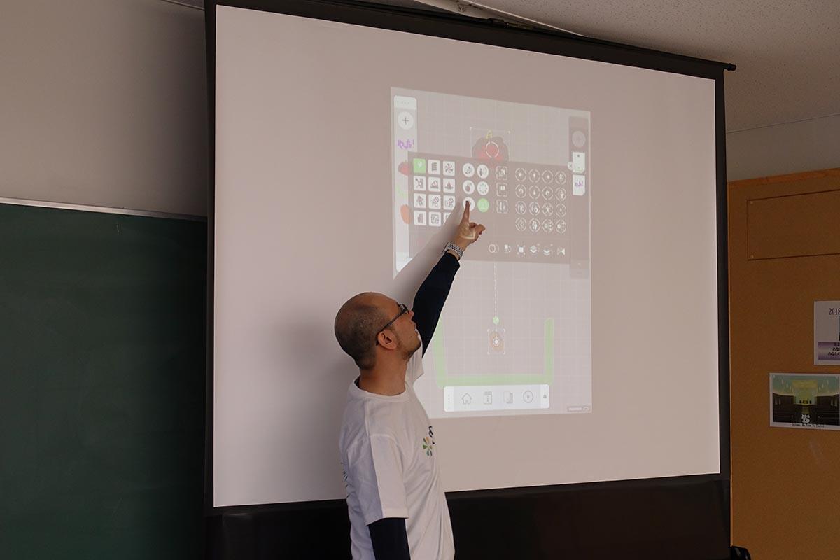 ① チュートリアル(20分) 教室前方に大きく表示される画面を見ながら講師と一緒に簡単なデジタル作品(コロコロゲームなど)を制作し、アプリの基本的な操作とできることを学ぶ。いわゆるハンズオン形式。