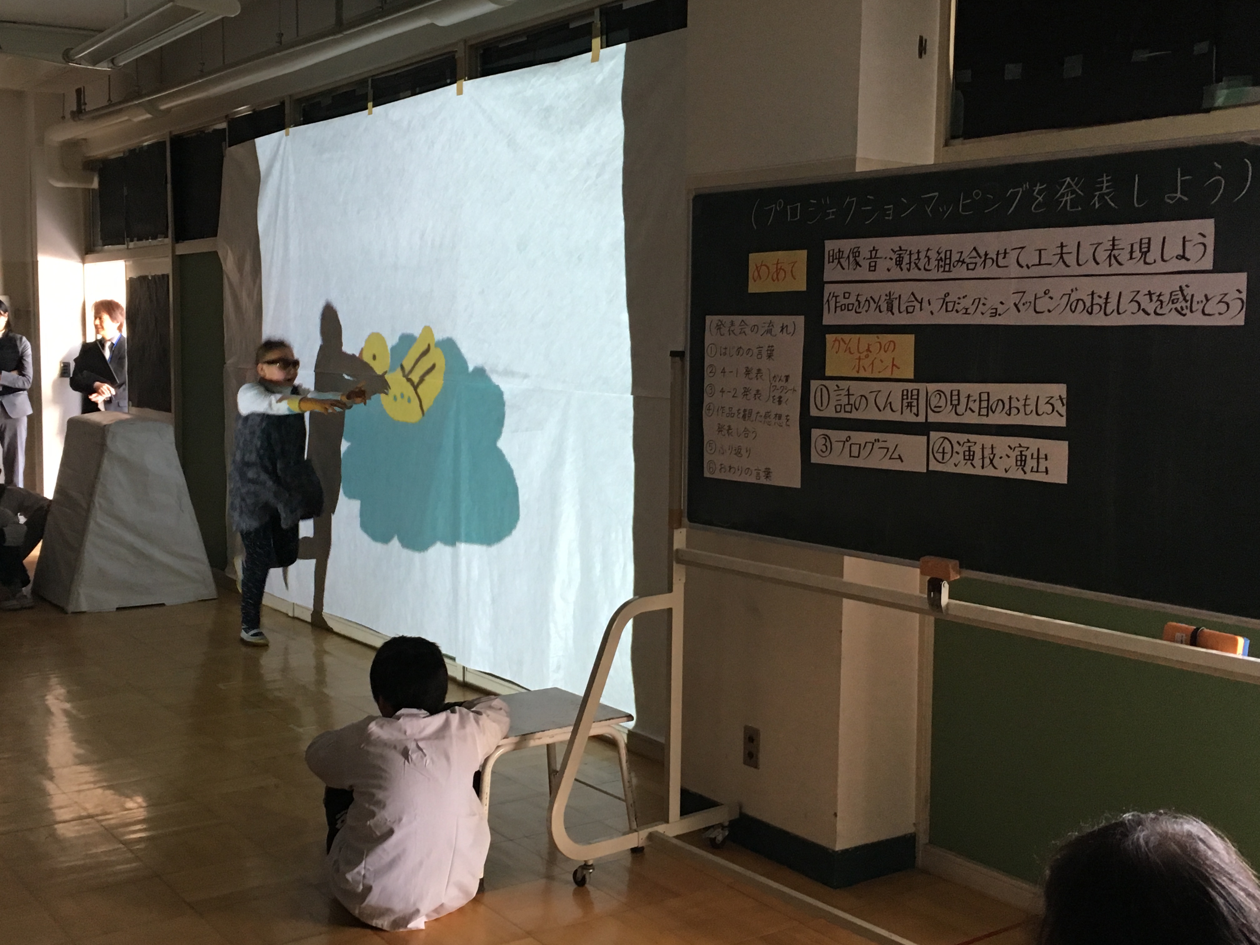 プロジェクションマッピング(英語名:Projection Mapping)とは、パソコンで作成したCGとプロジェクターの様な映写機器を用い、建物や物体、あるいは空間などに対して映像を映し出す技術の総称です。児童がこれまでに経験した事のない新しい表現ができると考えました。作品のテーマに合わせたプログラムを工夫して表すことで発想や創造的な技能の育成につながると考えました。