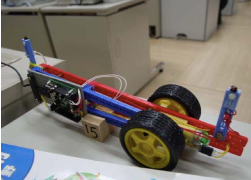安価で簡易な Arduino ベースの NanoBoardAG を実機に搭載し、センサやモータを計測・制 御の授業を実践しました。 実機はプラスチックフレームにギア付きモータ1個とナノボードとcdsセンサを2つ取り つけました。今回は各領域の指導時間確保の観点から実機の製作は行わいませんでした。