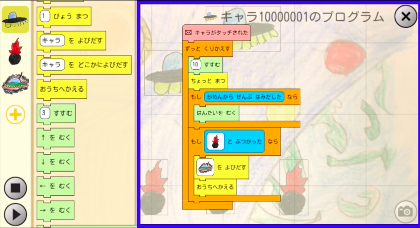 そうですね。(笑)さらに、「もし主人公がUFOにぶつかったら、そのUFOが爆発する」というストーリーに合わせて絵を描き、そのあとプログラムを組んでいくのですが、それをいかに迫力あるように見せるかとか、作品のクオリティを上げるために、こどもたちは試行錯誤していましたね。