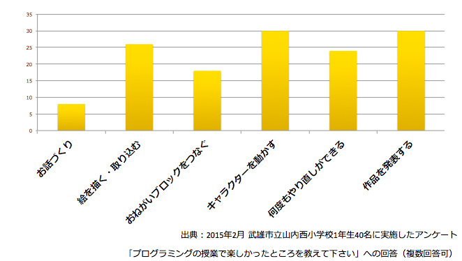あと、もう一つは「発表」。8回目の授業で、同級生や親御さん、他の学校の先生の前で自分のつくったものをプレゼンテーションしてもらったのですが、その発表が楽しかったと答えた児童が一番多かった。プログラミングそのものや試行錯誤が楽しかったというのはある程度予想されたことではあったんですが、「発表」が1番だったのは嬉しかったですね。