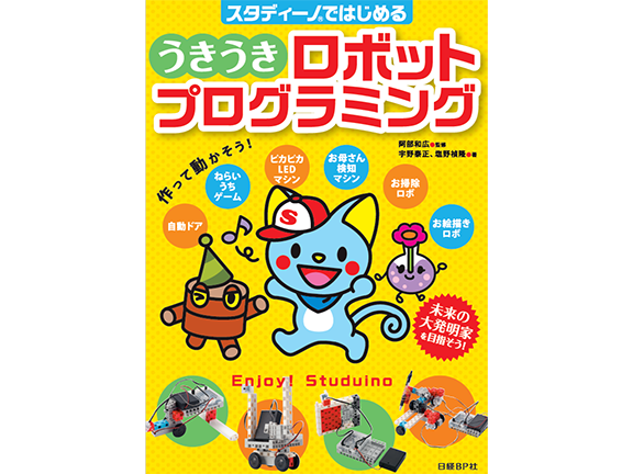 スタディーノではじめる うきうきロボットプログラミングは手軽かつ自在に組み立てられるアーテックブロックと、比較的安価なコンピューター基板(Studuino)を使って、 モノ作りの面白さ・楽しさを伝える、小学生向けの学習書です。ロボットを組み立てて、それをプログラミングで制御することを体験することで、仕組みを考えて、工夫して、完成させて、実用することを楽しみながら学べます。