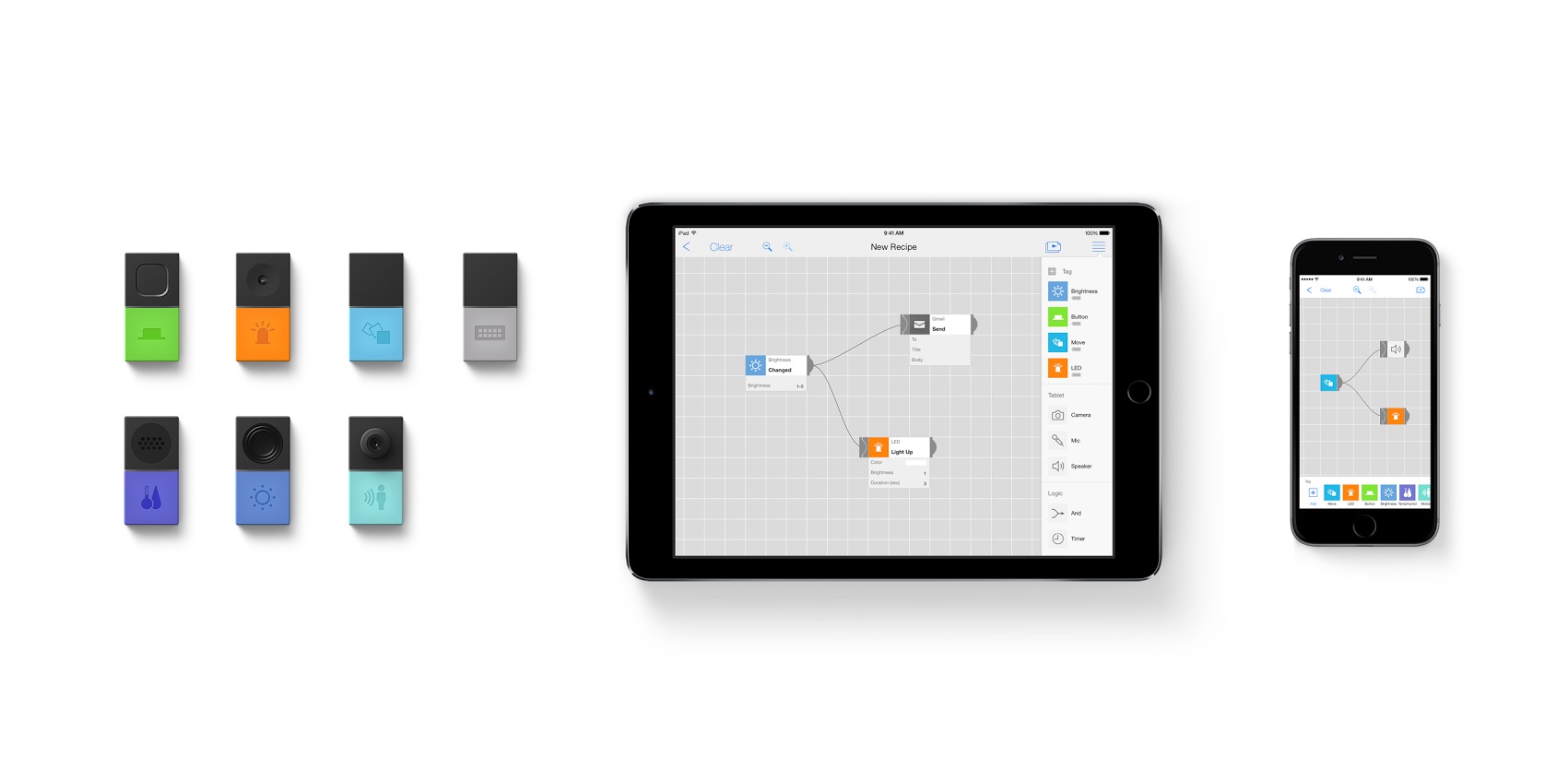 MESHタグは、それぞれ動きセンサー/ライト/ボタン/明るさセンサーなどのさまざまな機能を持ち、無線でMESHアプリとつながることができます。MESHアプリ上でこれらのタグを連携させ、自分で考えたアイデアがかんたんに実現できます。